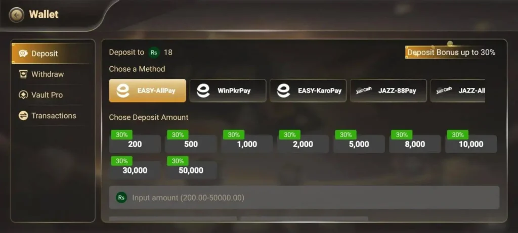 • Secure Payments: The Gold08 app protects users’ transactions. You can deposit using E-Wallets like Jazz Cash and the Easy Paisa app.
