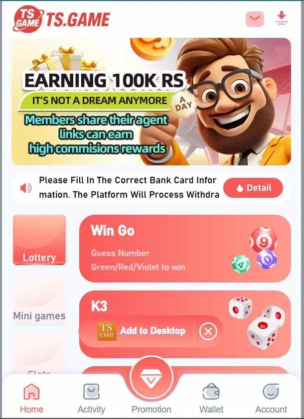 TS stands out as the best-earning app in Pakistan for 2025. It is newly developed with beautiful themes and content. It is simple, easy, free, to download, install, and use. Nowadays, everyone is trying to earn from online games, and this is one of them. By playing games on this platform, you can make your dreams come true. It depends 50% on your luck and 50% on your work. You have to play it wisely becasue you can loss as well. Moreover, it offers its best features for the gamers to keep them engaged.